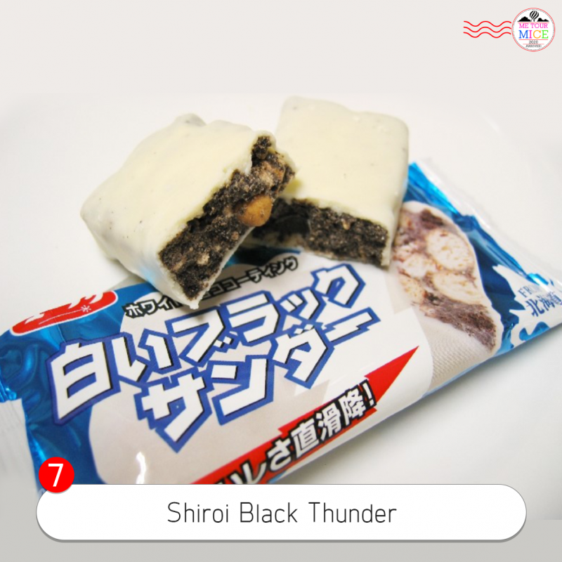ที่สุดของขนมและของฝากจากฮอกไกโด Shiroi Black Thunder ช็อคโกแลตบาร์ที่ทำมาจากคุกกี้รสช็อคโกแลตผสมข้าวพองเคลือบซ้ำด้วยไวท์ช็อคโกแลตสูตรเข้มข้น Shiroi Thunder ทั้งแบบสีขาวและสีดำผลิตมาจากโรงงานที่ซัปโปโรและมีขายเฉพาะในฮอกไกโดเท่านั้น