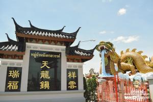 หมู่บ้านมังกรสวรรค์ ตั้งอยู่ภายใน อุทยานมังกรสวรรค์ (ศาลเจ้าพ่อหลักเมือง) และ พิพิธภัณฑ์ลูกหลานพันธุ์มังกร จังหวัดสุพรรณบุรี ค่ะ ที่นี่เป็นหมู่บ้านจีนโบราณที่จำลอง ลี่เจียง เมืองเก่าแก่โบราณกว่า 800 ปี ซึ่งเป็น 1 ใน มรดกโลกของประเทศจีนมาไว้ที่นี่อย่างประณีต และภายในหมู่บ้านที่ออกแบบได้สวยงามลงตัว เหมือนได้เดินเข้าไปในหมู่บ้านโบราณของเมืองจีนจริงๆ เลยทีเดียวน้า มีมุมเก่ๆ ให้เดินถ่ายรูปเพียบเลยค่ะ