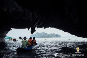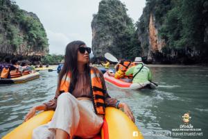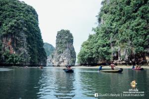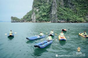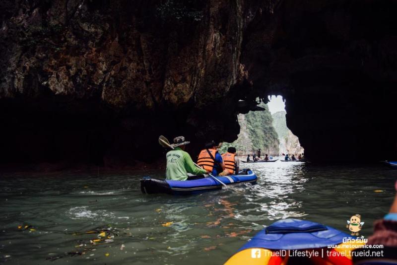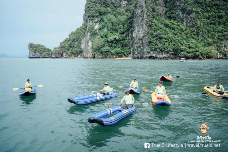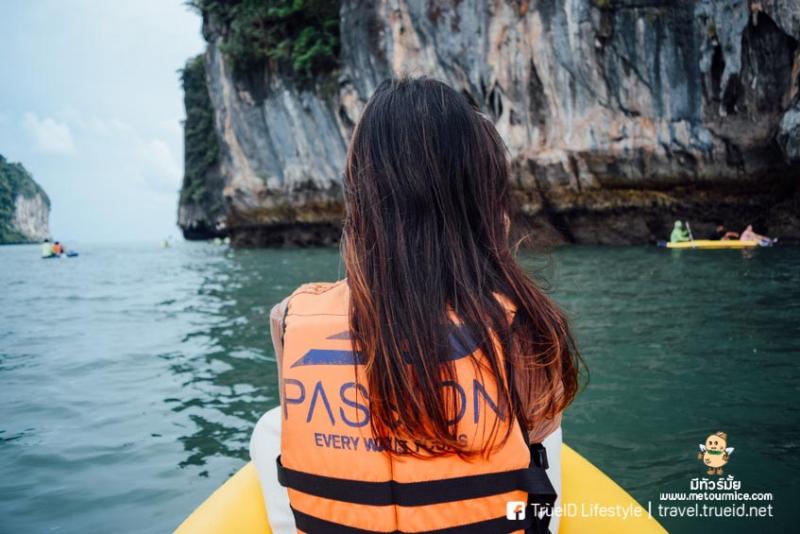 และที่ที่นักท่องเที่ยวนิยมมาพายแคนูมากที่สุดในอ่าวพังงานั้นก็คือ เกาะห้อง นั่นเอง ซึ่งจะเป็นเกาะที่ประกอบด้วยภูเขาหินปูนลูกน้อยใหญ่เรียงตัวโอบล้อมผืนทะเลไว้ในลักษณะเกือบจะเป็นทรงกลมคล้ายกับห้องขนาดใหญ่จึงเรียกกันว่า “เกาะห้อง” นั่นเองค่ะ พอเรามาถึงตรงนี้ คุณลุงก็จะพายเรือแคนูมาพร้อมต้อนรับกันเลยค่ะ เราก็จะทยอยลงเรือแคนูไปกับคุณลุง ใครที่ใจกล้าหน่อย อยากจะขอพายเอง ลุงเขาก็ไม่ได้ว่านะจ๊ะ แต่ขาไปเราให้ลุงพายพาไปเที่ยวกันก่อน