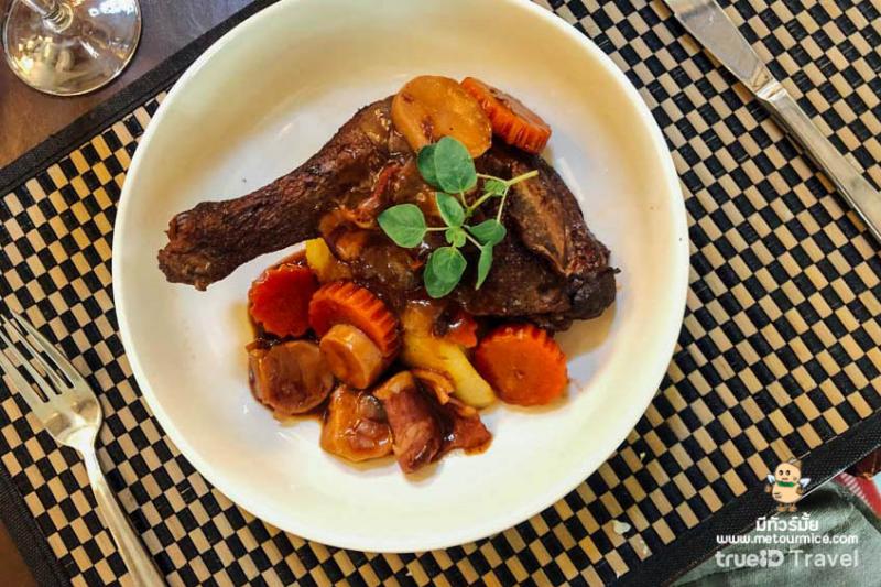 มาถึงเมนูจานหลักของมื้อนี้ ก็คือ สเต็กน่องไก่ ที่บอกเลยว่าเพียงแค่พนักงานนำมาเสิร์ฟที่โต๊ะ ก็น้ำลายหกเลยทีเดียว ! ต้องขอบอกเลยว่านอกจากหน้าตาจะน่าทานแล้ว รสชาติยังสุดยอดอีกด้วย ฟินเต็มคำสุดๆ
