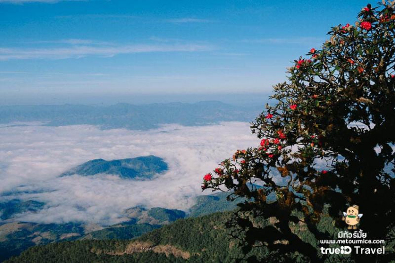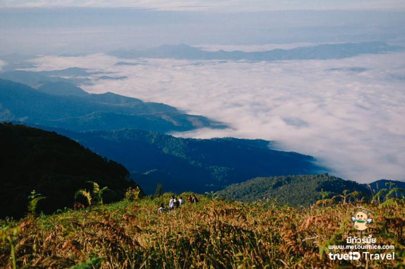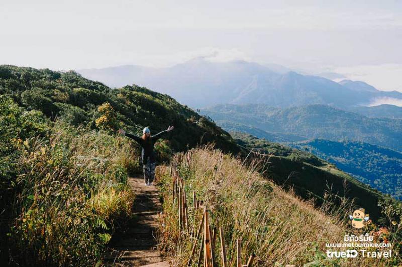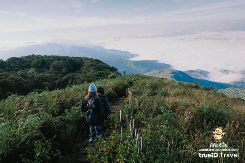 ต่อมาก็จะเป็นการเดินตามแนวสันเขาค่ะ จะไม่อันตรายเลยถ้าปฏิบัติตัวตามที่พี่ไกด์บอก เดินเป็นแถวเรียงเดี่ยวกันลงไปเรื่อยๆ ระหว่างนั้นก็แวะชมธรรมชาติตามทางไปค่ะ จะมีทั้ง กุหลาบพันปี ที่ขึ้นมาชูกิ่งก้าน ดอกสีแดงบายสวยรับลมหนาว และทุ่งหญ้าสวยๆ ตามทางไปเรื่อยๆ จนไปถึงจุดชมวิวอีกแห่งที่จะมองเห็น พระมหาธาตุนภเมทนีดล และ พระมหาธาตุนภพลภูมิสิริ ตั้งอยู่คู่กันสวยงาม ค่ะ แต่จังหวัดนี้แอบย้อนแสงหน่อยๆ