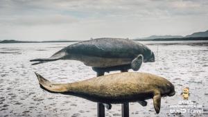 ทางเดินสะพานไม้ที่ทอดยาวไปสู่ปากอ่าวนั้น จะมีศาลาชมวิวให้รับลมทะเลเย็นๆ และมีอนุสรณ์ หมูดุด หรือ พะยูน อยู่ด้วยค่ะ เมื่อก่อนนั้นจะมีหมูดุดที่ อ่าวคุ้งกระเบน เป็นจำนวนมาก แต่ปัจจุบันได้สูญพันธุ์ไปแล้ว ทางศูนย์ศึกษาฯ เลยทำอนุสรณ์ไว้เพื่อให้ความรู้แก่ผู้ที่เข้ามาชมค่ะ และบริเวณปลายของเส้นทางเดินศึกษาธรรมชาตินั้น จะมีจุดสาธิตบ่อกุ้งกุลาดำ ที่เป็นระบบปิดไม่ก่อให้เกิดมลภาวะ และยังเป็นบริเวณของป่ารอยต่อระหว่างป่าชายเลน ป่าชายหาด และป่าบก อีกด้วย แสดงให้เห็นถึงการอยู่ร่วมกันของป่าที่นับว่าสมบูรณ์มากๆ