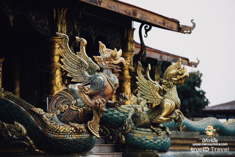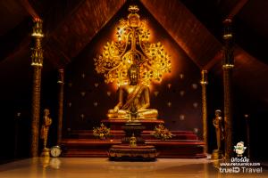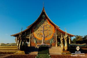 ส่วนตัวอุโบสถมีต้นแบบมาจากวัดเชียงทอง ประเทศลาว แต่มีความกว้างมากกว่า 1 เท่า และความยาวมากกว่า 2 เท่า เสาแต่ละต้นลงลวดลายด้วยมืออย่างปราณีตค่ะ โดยรอบนอกเป็นลายดอกบัวและสัตว์ทั้งหลายตามคติบัว 4 เหล่า หัวใจหลักของการทำพุทธศิลป์คือ การนำเสนองานศิลปะที่เกิดจากความสงบ ความเพียร ความอดทน และวิสัยทัศน์ ซึ่งงานแต่ละชิ้นต้องคิดจากความคิดอันวิจิตรจริงๆ ค่ะ อย่างแนวคิดการจำลองให้วัดเป็นเขาพระสุเมรุ ตรงกลางของพระอุโบสถ เป็นที่ตั้งของพระประธาน แต่เดิมที่คล้ายกับพระพุทธชินราช ในจังหวัดพิษณุโลก แต่มีการนำเพียงส่วนรัศมีออกไป เพื่อให้แลดูกลมกลืนกันยิ่งขึ้น พร้อมกับได้ทำฉากหลังเป็นต้นโพธิ์ โดยเบื้องบนติดด้วยแผ่นพระทอง