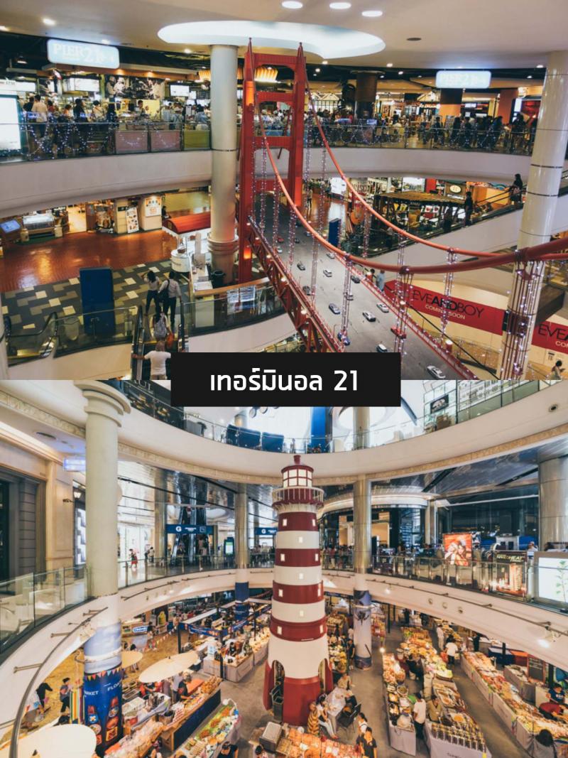 เทอร์มินอล 21 Shopping Mall เทรนด์ใหม่ กลางสุขุมวิท ที่มาในธีมของสนามบิน ซึ่งในแต่ละชั้นถูกออกแบบให้กลายเป็นเมืองใหญ่ต่างๆ จากทั่วโลก ทั้ง ลอนดอน โตเกียว ซานฟรานซิสโก อิสตันบูล เป็นต้น บอกเลยว่า แค่เดินเล่นถ่ายรูปก็ชิลมากๆ แล้วค่ะ นอกจากนี้ ที่นี่ยังมีทั้งร้านอาหาร ร้านค้า สินค้าแบรนด์ดังต่างๆ รวมไว้ในที่เดียว ขาช้อปต้องยิ้มหน้าบานแน่ๆ