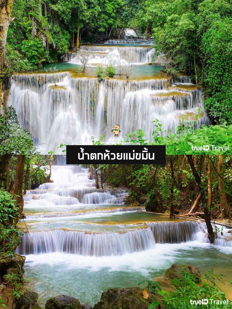 น้ำตกห้วยแม่ขมิ้น เป็นน้ำตกที่สามารถเที่ยวได้ตลอดทั้งปี ซึ่งตั้งอยู่ในพื้นที่อุทยานแห่งชาติเขื่อนศรีนครินทร์ค่ะ มีทั้งหมด 7 ชั้นด้วยกัน ตั้งแต่ชั้นแรกถึงชั้น 4 มีระยะทางแค่ 300-750 เมตรเท่านั้น แต่ชั้น 5 ขึ้นไปจนถึงชั้นบนสุดของน้ำตก จะมีระยะทางมากกว่า 1 กิโลเมตรค่ะ แต่ละชั้นเลยมีความสวยงามในแบบที่ต่างกันไป และที่นี่ยังได้ชื่อว่า เป็นน้ำตกที่สวยที่สุดในกาญจนบุรีอีกด้วย