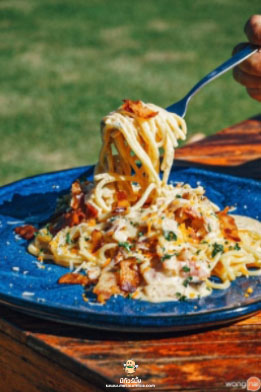 แต่ถ้าเพื่อน ๆ หิว! ก็มีอาหารจานเด็ดที่พร้อมเสิร์ฟ เลยขอสั่ง เมนูหนัก ๆ ให้อิ่มท้องอย่างเมนู Pork Shop Steak (ราคา 360 บาท) พอร์กช็อปย่างไฟหอม ๆ เสิร์ฟมาพร้อมกับมันฝรั่งอบชีส และผักย่างสไตล์บาร์บีคิว ที่มีทั้งพริกหยวกสามสีและมะเขือม่วงนุ่ม ๆ ปิดท้ายด้วยการราดซอสเห็ดสูตรพิเศษ และขอลองสั่ง “สปาเกตตีคาโบนาร่าไข่เค็ม” (ราคา 290 บาท) เมนูซิกเนเจอร์ของร้าน บอกเลยว่าเด็ดสมกับที่เป็นเมนูซิกเนเจอร์ประจำร้านจริง ๆ เส้นสปาเกตตีที่สุกกำลังดี พร้อมกับมีความละมุนของครีมซอส ที่เข้ากันกับไข่เค็มได้เป็นอย่างดี มีรสชาติหอมมัน