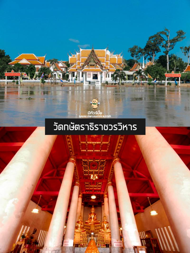 วัดกษัตราธิราชวรวิหาร เป็นพระอารามหลวงเก่าสมัยกรุงศรีอยุธยา ตั้งอยู่ริมแม่น้ำเจ้าพระยา เป็นวัดโบราณสร้างขึ้นในสมัยกรุงศรีอยุธยาเป็นราชธานี มีพระปรางค์เป็นประธานของวัด สถานที่สำคัญภายในวัดคือ พระประธานในพระอุโบสถ ที่มีแท่นฐานผ้าทิพย์ปูนปั้น ประณีตงดงาม ใบเสมาของพระอุโบสถเป็นใบเสมาคู่แกะสลักลวดลายวิจิตรบรรจง