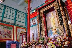 องค์เจ้าแม่กวนอิมนั้น ทำด้วยไม้จันทร์เนื้อหอมแกะสลัก รูปแบบศิลปะราชวังถัง แต่สันนิษฐานว่าสร้างขึ้น ในสมัยของราชวงศ์ซ่ง เมื่อประมาณ 800-900 ปีมาแล้ว องค์เจ้าแม่กวนอิมนั้นมีสีทองอร่าม โดดเด่น และสวยงามมากๆ อีกด้วย