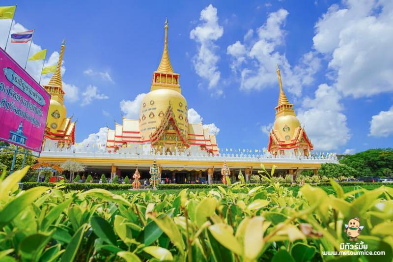 ในส่วนของ พระอุโบสถมหาเจดีย์ นั้น นับว่าเป็นอุโบสถขนาดใหญ่ที่มีลักษณะแปลกตาไม่เหมือนที่ไหนเลยค่ะ เพราะแนวคิดในการสร้างนั้นได้มาจาก ทัชมาฮาล ประเทศอินเดีย นั่นเองค่ะ เป็นลักษณะของเจดีย์ 3 องค์ องค์กลางเป็นพระสถูปใหญ่ ด้านข้างเป็นพระสถูปบริวาร เจดีย์เป็นทรงของระฆังคว่ำ ที่ชั้นล่างนั้น จะเป็นใต้ถุนโล่ง ใช้ในการฟังเทศน์ ฟังธรรม ไหว้พระต่างๆ ส่วนชั้นบนนั้น ก็จะเป็นบริเวณลานกว้างรองรับองค์เจดีย์ นั่นเอง