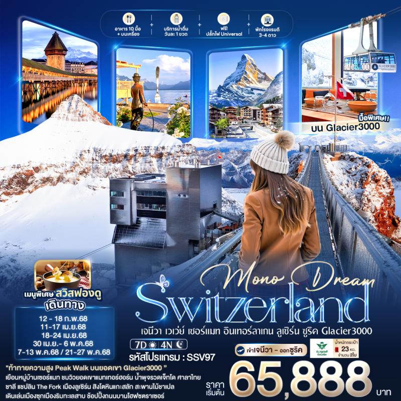 วันที่ 2 ท่าอากาศยานนานาชาติสุวรรณภูมิ - ท่าอากาศยานนานาชาติคิงอับดุลลาซิส แวะพักเปลี่ยนเครื่อง – ท่าอากาศยานนานาชาติเจนีวา ประเทศสวิตเซอร์แลนด์ – เมืองเจนีวา - ทะเลสาบเจนีวา – น้ำพุจรวดเจ็ทโด - เมืองเวเว่ย์ - รูปปั้นชาร์ลี แชปลิน +The Fork – เมืองมองเทรอซ์ - เมืองซาน เลอเจียร์ ลา ชิเอซาซ