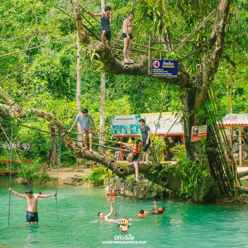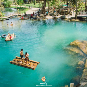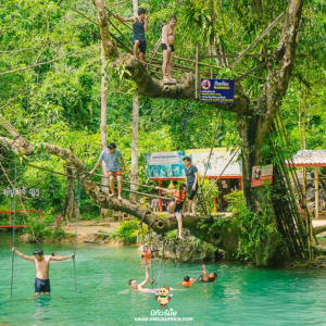 บลู ลากูน (Blue Lagoon) สระน้ำสีฟ้าใสที่เกิดขึ้นตามธรรมชาติ ตั้งอยู่บริเวณด้านหน้าของ ถ้ำภูคำ (Tham Phu Kham Cave) ที่เที่ยวยอดนิยมสุดๆ สำหรับนักท่องเที่ยวที่ไปเที่ยววังเวียงค่ะ ที่นี่มีน้ำในสระใสราวกับคริสตัลและเป็นสีฟ้า มองเห็นพื้นดินด้านล่างได้อย่างชัดเจน ที่ด้านข้างสระมีต้นไม้ใหญ่ สามารถไต่เชือกกระโดดน้ำได้อย่างสนุกสนานอีกด้วย