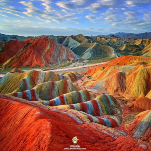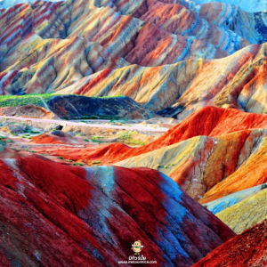 เทือกเขาแห่งนี้ มีชื่อว่า “เขาสายรุ้งตันเซี๋ย” (Danxia Landform) เป็นแนวเขาที่มีลวดลายเป็นริ้วสีธรรมชาติ โทนสีที่เราเห็นเด่นชัดที่สุดคือโทนสีแดง ประกอบไปด้วยหินทรายและแร่ธาติต่างๆ ที่เกิดขึ้นจากการเคลื่อนตัวของเปลือกโลกเมื่อ 24 ล้านปีก่อน ลม และ ฝนใช้เวลานานนับพันๆปี กัดเซาะแนวเขาจนเกิดเป็นภูมิประเทศที่กว้างใหญ่ไพศาลและมีสีสันสุดแสนจะมหัศจรรย์ดั่งเช่นทุกวันนี้