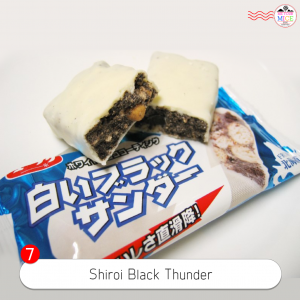 ที่สุดของขนมและของฝากจากฮอกไกโด Shiroi Black Thunder ช็อคโกแลตบาร์ที่ทำมาจากคุกกี้รสช็อคโกแลตผสมข้าวพองเคลือบซ้ำด้วยไวท์ช็อคโกแลตสูตรเข้มข้น Shiroi Thunder ทั้งแบบสีขาวและสีดำผลิตมาจากโรงงานที่ซัปโปโรและมีขายเฉพาะในฮอกไกโดเท่านั้น