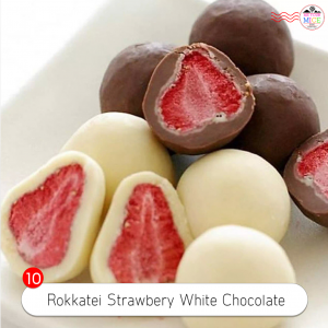 อีกหนึ่งผลิตภัณฑ์จาก Rokkatei ที่ได้รับความนิยมสูง ขนมรูปทรงกลมเหมือนลูกบอลสีขาวเคลือบไวท์ช็อคโกแลตบางๆ สอดไส้ผลสตรอเบอร์รี่แห้งให้รสสัมผัสทั้งเปรี้ยวและหวานกลมกล่อมและมีกลิ่นหอมอบอวลอยู่ในปากเข้ากันได้เป็นอย่างดี ด้วยเอกลักษณ์ของรสชาติและเนื้อกรุบกรอบของสตรอเบอร์รี่ทำให้ Rokkatei Strawbery White Chocolate โดดเด่นออกมาจากขนมจากช็อคโกแลตอื่นๆ