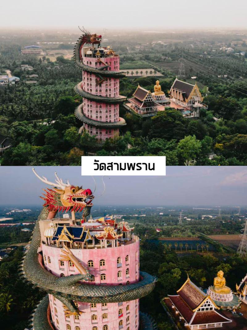 วัดสามพราน เป็นวัดสวยอีกแห่งในนครปฐมค่ะ ความโดดเด่นของวัดสามพรานก็คือ หอคอยสีชมพูสูง 17 ชั้น ซึ่งมี มังกรตะกายฟ้า โอบรอบ ซึ่งการเดินขึ้นไปบนยอดตึกนั้น เราต้องเดินผ่านอุโมงค์ทางลาดที่อยู่ภายในตัวมังกร ซึ่งเหมือนท้องพญามังกรขึ้นไปด้านบน