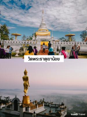 วัดพระธาตุเขาน้อย ตั้งอยู่ในจังหวัดน่านค่ะ องค์พระธาตุตั้งอยู่บนยอด ดอยเขาน้อย ซึ่งสูงจากระดับน้ำทะเลประมาณ 240 เมตร มีสถาปัตยกรรมเป็นศิลปะพม่าผสมผสานกับล้านนาสวยงาม ภายในบรรจุ พระเกศาธาตุขององค์พระพุทธเจ้า ที่ด้านหน้าวัดจะมีทางขึ้นไปองค์พระธาตุ เป็นบันไดนาค 303 ขั้นเลยทีเดียวค่ะ ที่นี่จึงกลายเป็นจุดชมวิวที่สวยที่สุดของจังหวัดน่านอีกด้วย