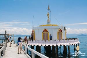 ตัวโบสถ์มีลักษณะคล้ายมีดอกบัวมาโอบอุ้มโบสถ์อยู่อีกที มองไปแล้วสวยงามมาก ยิ่งอยู่กลางทะเลที่มีฟ้าสีคราม น้ำทะเลใสๆ แบบนี้ สวยจนแทบลืมหายใจไปเลยค่ะ นักท่องเที่ยวที่มาเที่ยวเกาะพยามมักจะมาแวะเวียนสักการะพระพุทธรูปในโบสถ์กลางน้ำนี้เสมอเพื่อเป็นสิริมงคลแก่ตัวเอง