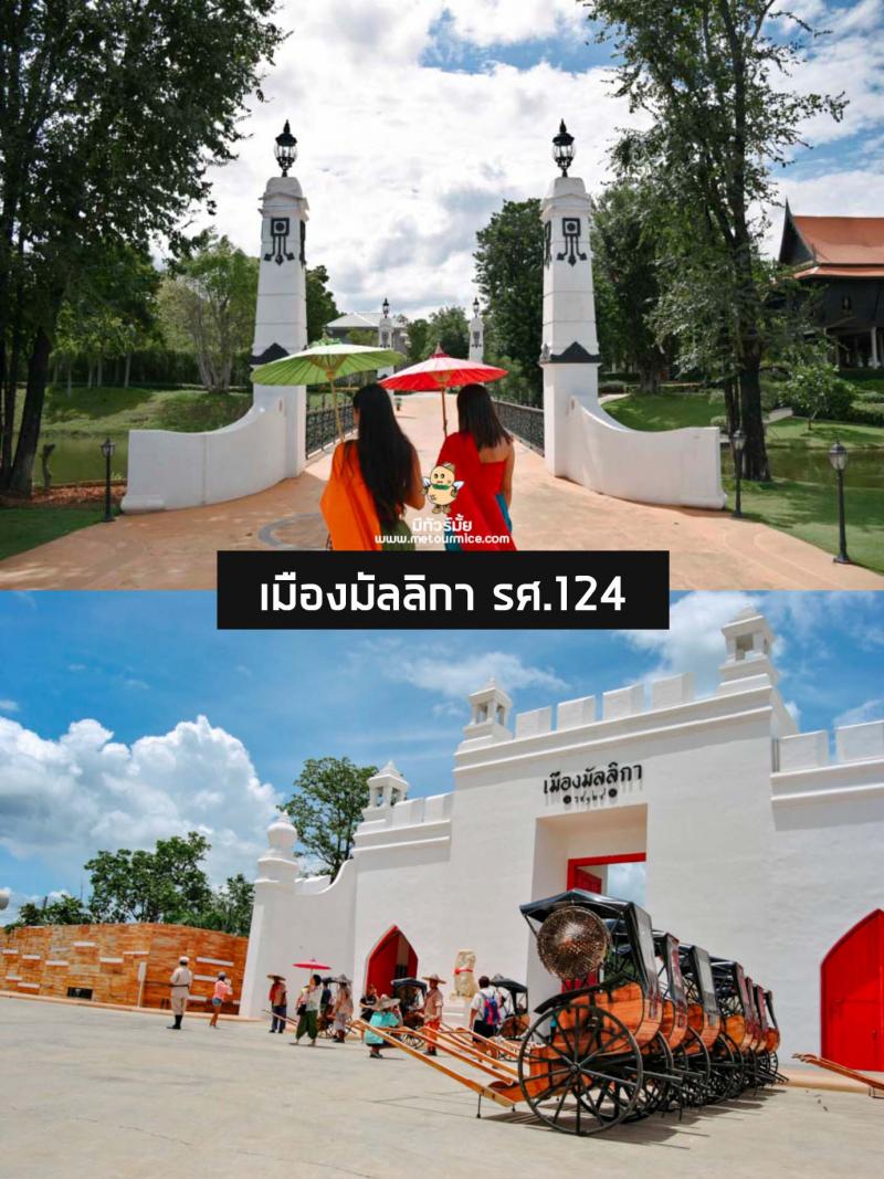 เมืองมัลลิกา รศ.124 เป็นเมืองย้อนยุค โดยที่จะพาเราย้อนเวลากลับไปยังสมัย ร.5 ค่ะ ภายในมีการจำลองวิถีชีวิตแบบโบราณ ลักษณะความเป็นอยู่ของชาวสยามในอดีต ทั้งบ้านเรือนไทยหลังใหญ่ริมทุ่งนา เรือนไม้ที่มีศาลาริมน้ำ รวมถึงการเดินทางด้วยเรือของพ่อค้าแม่ค้าที่แต่งชุดไทยมาขายอาหารไทย ขนมไทย ผลไม้ต่างๆ