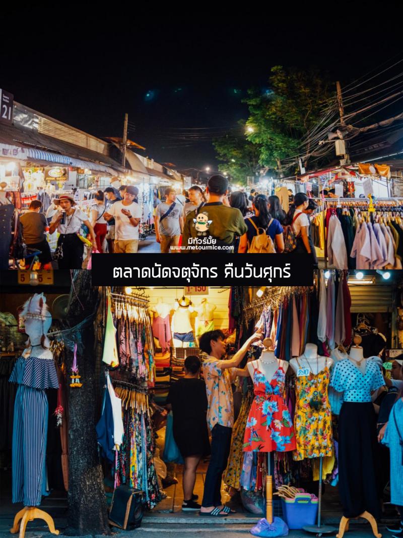 อ่ะๆ นอกจากตลาดต้นไม้ในทุกคืนวันอังคารแล้ว ทุกคืนวันศุกร์ ที่จตุจักรก็เอาใจสายช้อปกันด้วย ตลาดขายส่งเสื้อผ้า จตุจักร หลัง 2 ทุ่มเป็นต้นไป ร้านรวงก็จะเริ่มเปิดท้ายขายส่งกันเอาจริงเอาจังมากๆ เปิดไปยัน 7 โมงเช้า ช่วงตี 1 เป็นอะไรที่กำลังลดแลกแจกแถมกันทีเดียวค่ะ ส่วนใหญ่จะเป็นสินค้าประเภทเสื้อผ้าและสินค้าแฟชั่น ซึ่งเราจะสามารถซื้อได้ถูกกว่าปกติถึงครึ่งต่อครึ่งหากซื้อให้ปริมาณมากๆ แนะนำให้ชวนเพื่อนสาวขาช้อปไปด้วยกัน ซื้อรวมกัน 3 ตัวขึ้นไป ได้ถูกชัวร์ๆ อะไรจะดีต่อใจสายช้อปเบอร์นี้