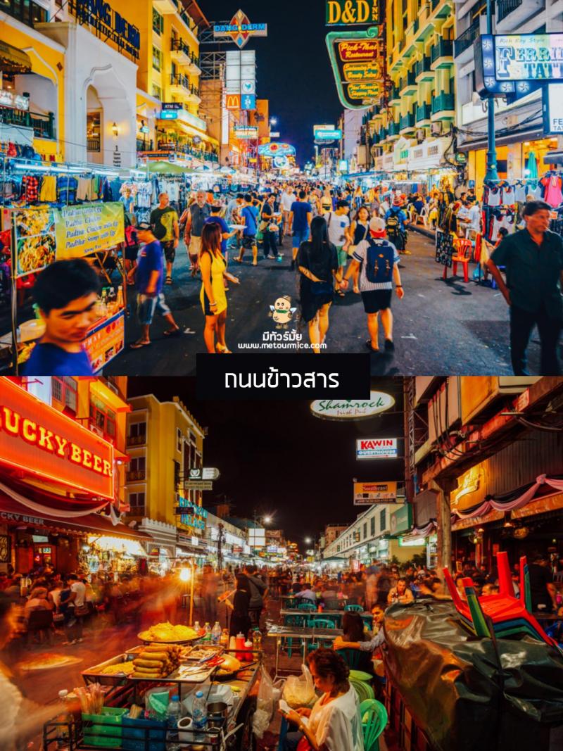 แหล่งท่องเที่ยวตอนกลางคืนที่มีร้านกินดื่มให้เลือกเยอะ เป็นย่านที่มีสีสันมากๆ ของกรุงเทพฯ คงหนีไม่พ้น ถนนข้าวสาร นั่นเองค่ะ เป็นถนนสายเล็กๆ แต่โด่งดังไปทั่วโลก รวมถึงยังมีสตรีทฟู้ดให้ได้อร่อยตลอดสองข้างทาง ทั้ง ร้านโจ้ก ร้านน้ำปั่น ร้านผัดไทย หอยทอด และอื่นๆ อีกเพียบ ใครหิวดึกๆ หรืออยู่บ้านเบื่อๆ ออกมาตะลุยถนนข้าวสารสักคืนดู รับรองรู้เรื่องงงงง
