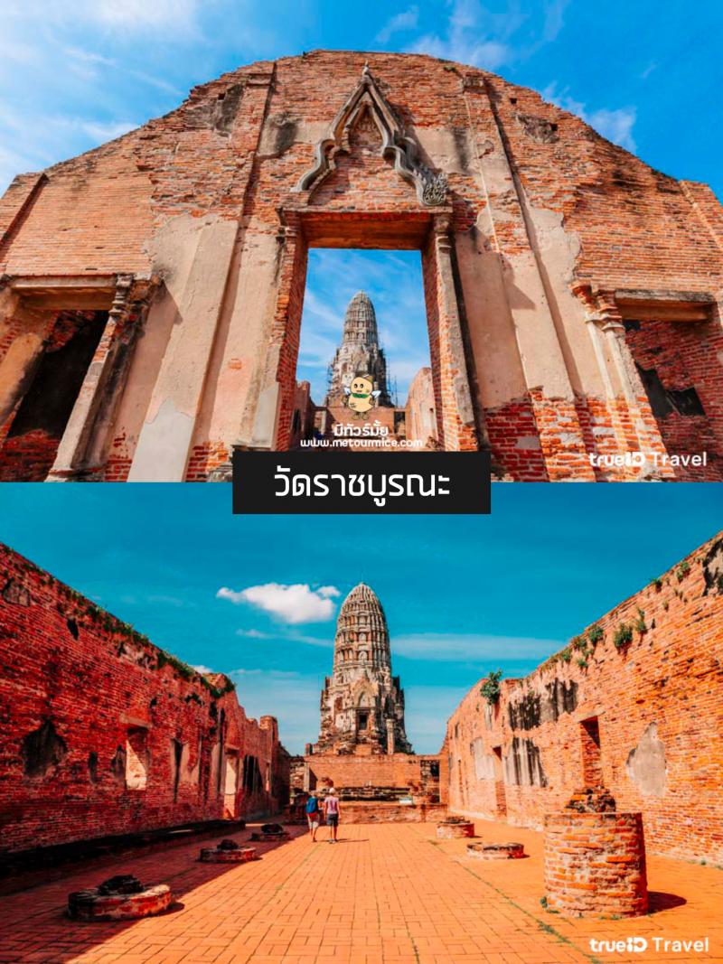 วัดราชบูรณะ สร้างขึ้นในรัชสมัยของสมเด็จพระบรมราชาธิราชที่ 2 หรือเจ้าสามพระยา ในปี พ.ศ. 1967 เป็นหนึ่งในวัดที่ใหญ่และมีความเก่าแก่มากที่สุดในอยุธยา โบราณสถานสำคัญในวัดก็คือ พระปรางค์วัดราชบูรณะ ซึ่งมีมีกรุใหญ่และลึก ทั้งหมด 3 ห้องใหญ่ๆ เรียงกันลงไป ห้องที่อยู่ในสุด เป็นห้องที่สำคัญที่สุด บรรจุพระบรมธาตุ ซึ่งเก็บรักษาอย่างดีในเจดีย์ทองคำและรอบๆ ยังเต็มไปด้วยพระพุทธรูปต่างๆ