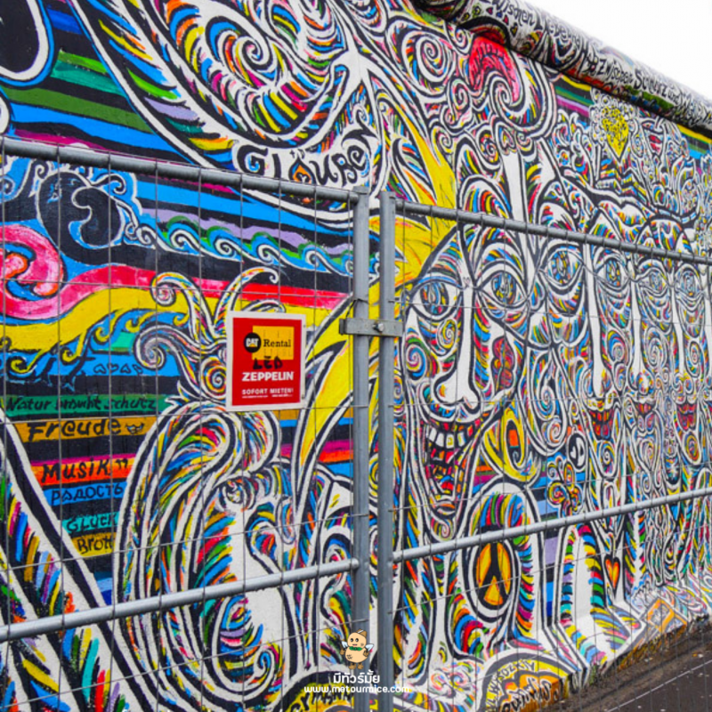 ภาพศิลปะบนซากกำแพงที่ยังคงเหลืออยู่ ระยะทางยาวกว่า 1200 หลา ที่ศิลปินจำนวนมากกว่า 118 คน ได้ถ่ายทอดเรื่องราวไว้บนกำแพง เป็นศิลปะที่มีชีวิตและเบื้องหลัง ภาพล้อเลียนที่โดดเด่น เช่น ภาพนักการเมืองผู้นำสองฝ่ายเยอรมันตะวันตกและตะวันออกที่จูบปากกัน